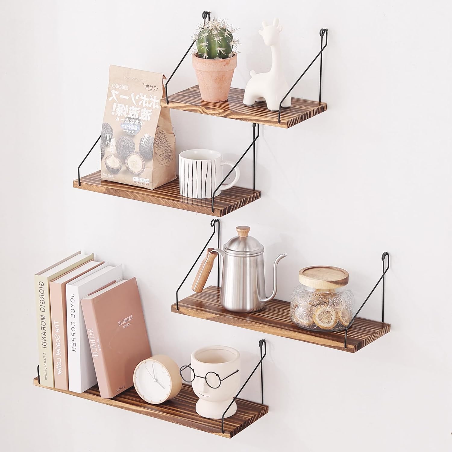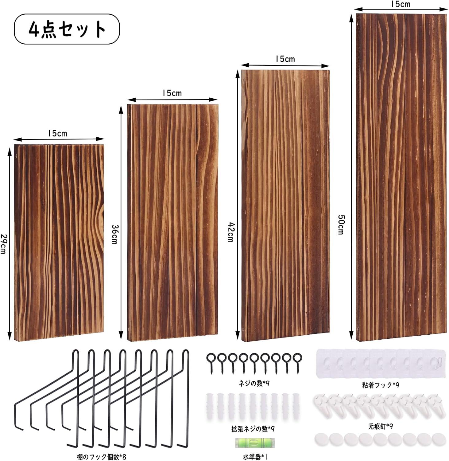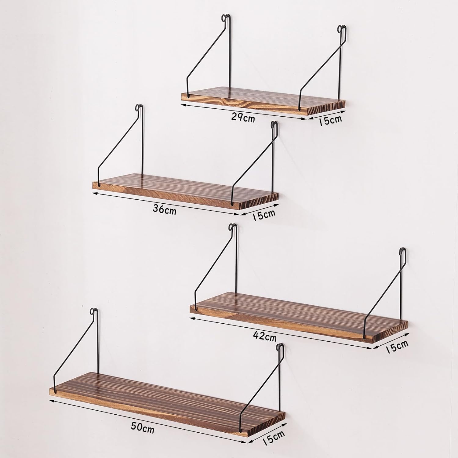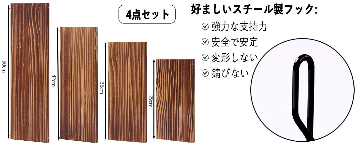 ウォールシェルフ 壁を傷つけない 29+36+42+50cm4点セット 壁掛け棚 賃貸 壁 棚 穴あけない ウォールラック 壁に付けられる家具 飾り棚木製 簡単取り付け 洗面所/キッチン/トイレ/玄関 壁棚収納 (ダークブラウン)