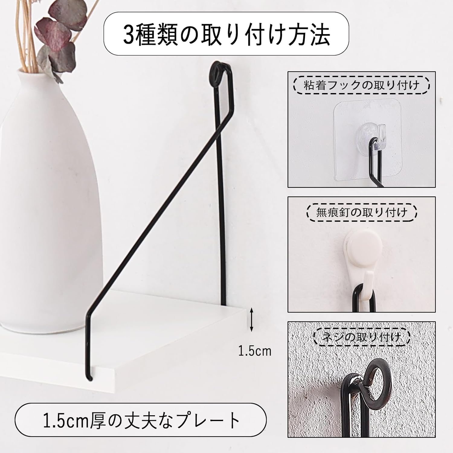 粘着フック無痕ネジ金属ロックネジの3種類の取り付け方法が選べます。賃貸でもして使用できます。設置方法によって耐荷重が異なりますので、設置場所や置きたい物の重量に応じて、自分に合った設置方法をお選びいただけます。