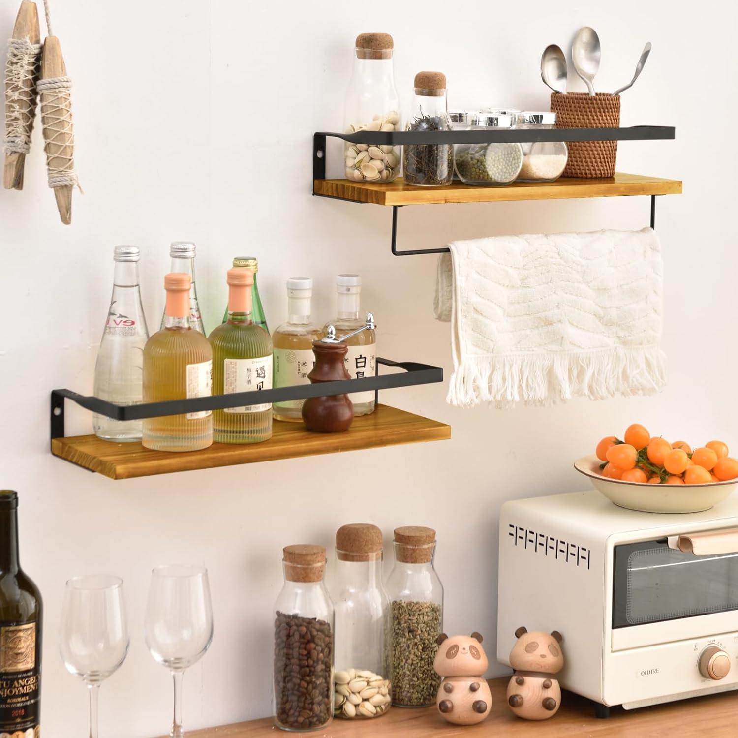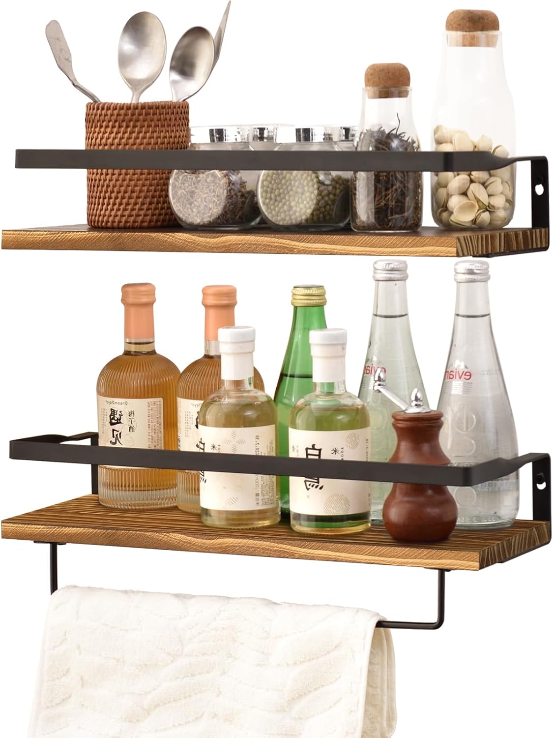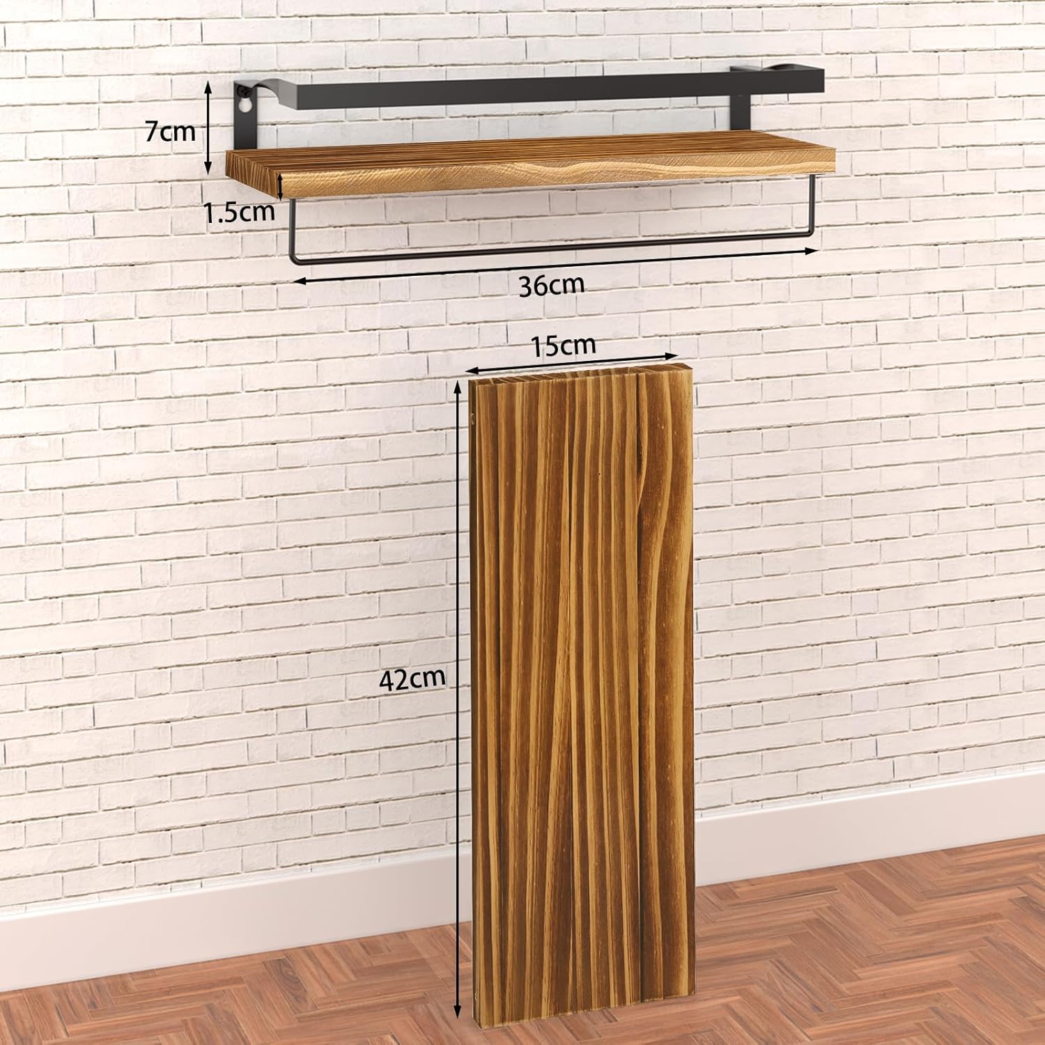 ウォールシェルフ 天然木製 42cm 2点セット 壁 棚 落下防止のガード タオル掛け付き 壁に付けられる家具 洗濯機/キッチン/トイレ/寝室/バスルーム/玄関トイレ/洗面所 収納棚 (ブラウン)