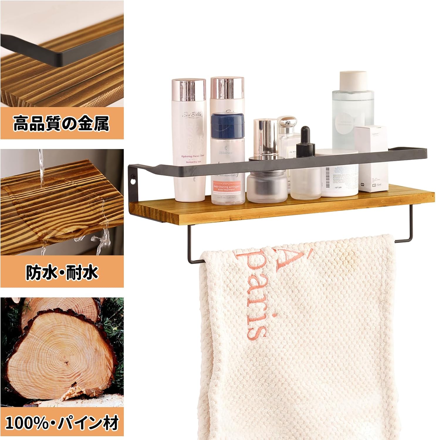 ウォールシェルフ 天然木製 42cm 2点セット 壁 棚 落下防止のガード タオル掛け付き 壁に付けられる家具 洗濯機/キッチン/トイレ/寝室/バスルーム/玄関トイレ/洗面所 収納棚 (ブラウン) (复制)