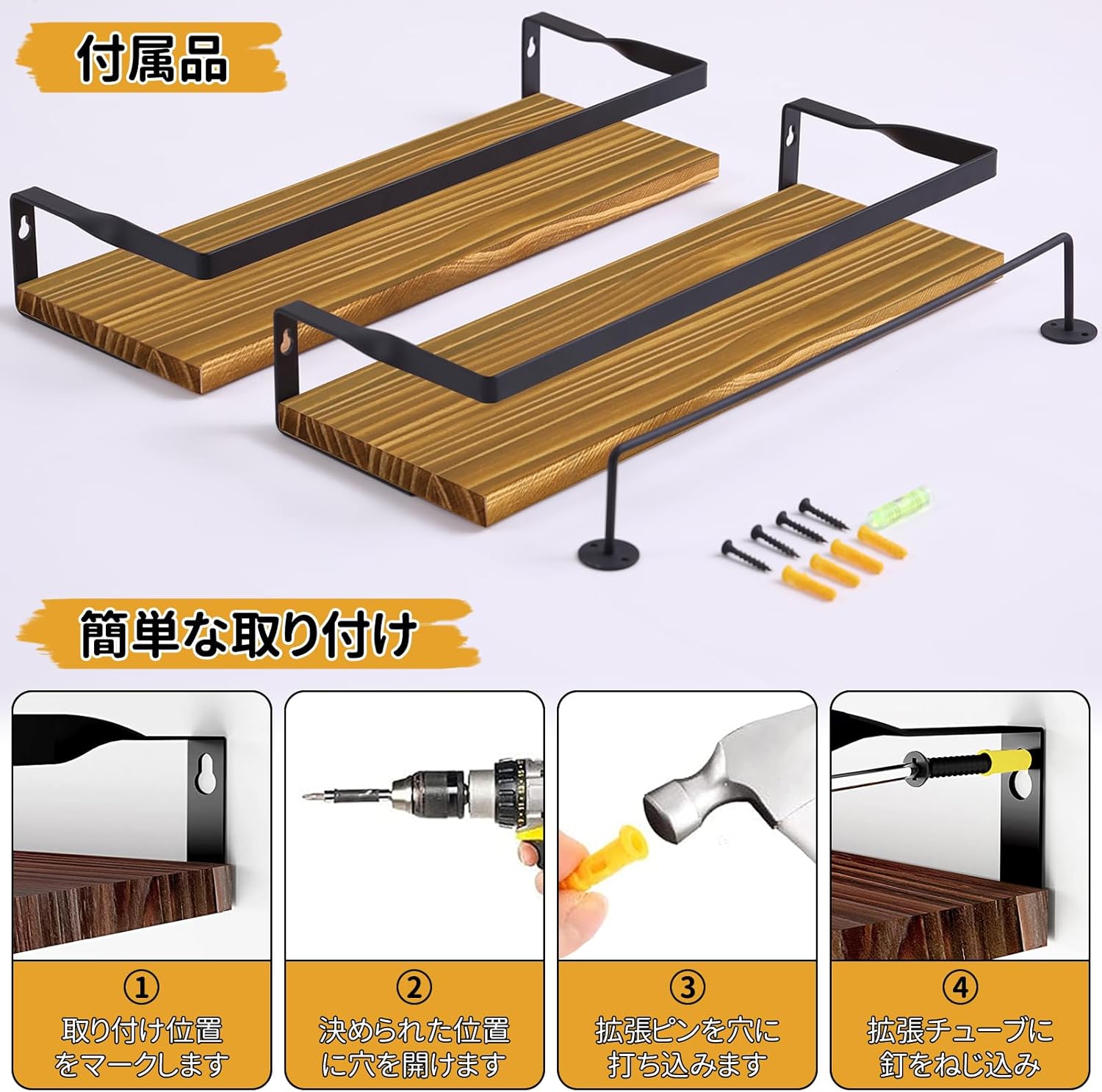 天然の手摘み木材、手作業でカット、研磨、染色。木材とスチールを組み合わせたモダンなウォールシェルフが。